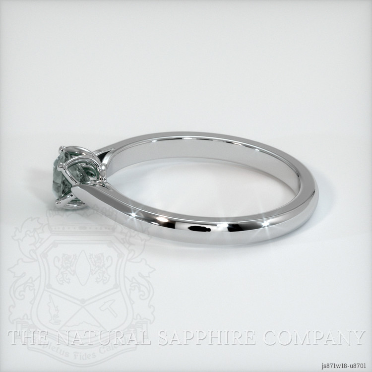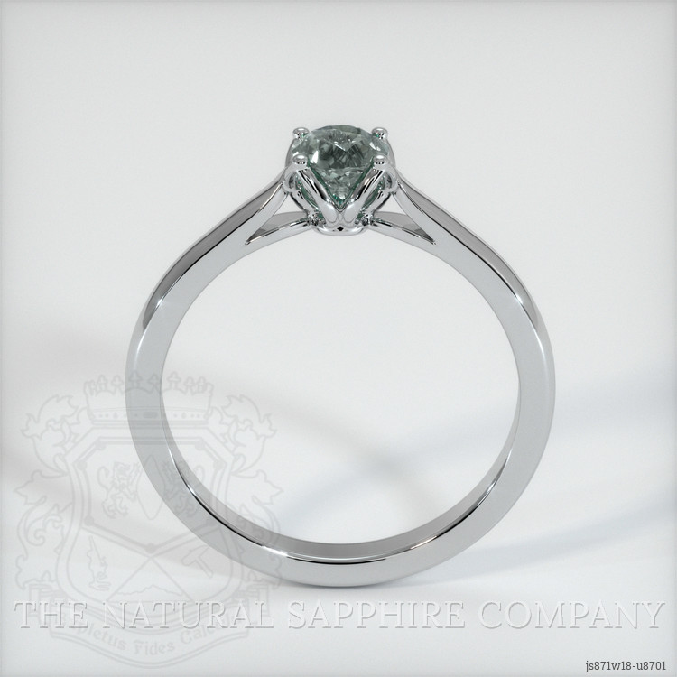 The ring features a beautiful, transparent 0.61 carat round shape bluish green sapphire with the dimensions of 4.69 x 4.64 x 3.55 mm and a modified brilliant cut. It has a clarity grade of slightly included (evaluated at eye level), medium intense color saturation, and an excellent polish. The origin of this sapphire is Montana.