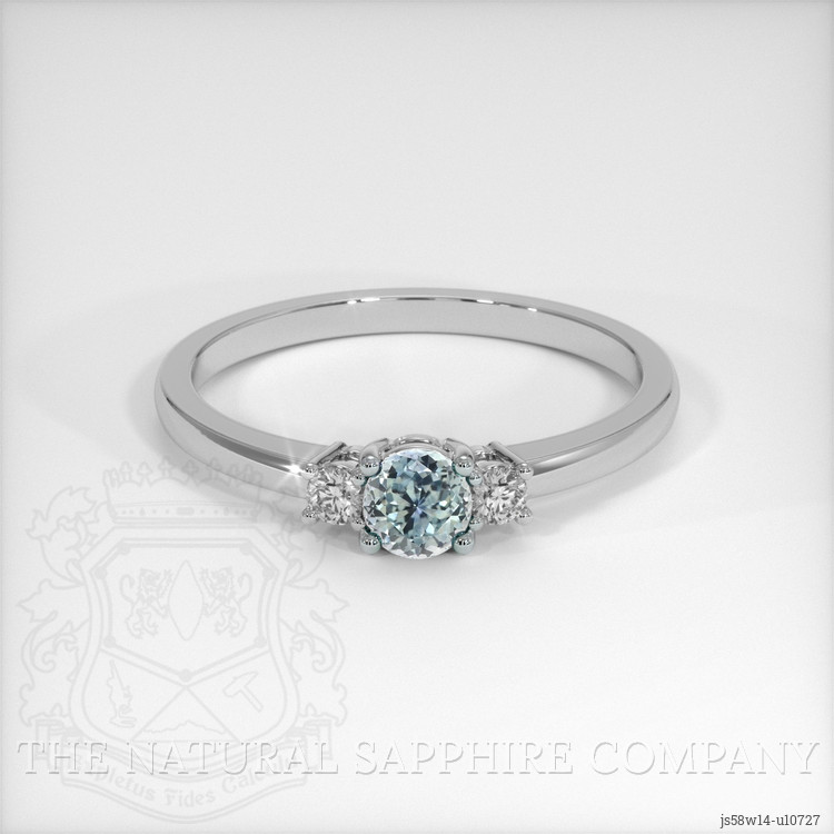 The ring features a beautiful, transparent 0.64 carat round shape bluish green sapphire with the dimensions of 5.12 x 5.06 x 3.40 mm and a mixed brilliant cut. It has a clarity grade of eye clean (evaluated at eye level), medium light color saturation, and an excellent polish. The origin of this sapphire is Montana.