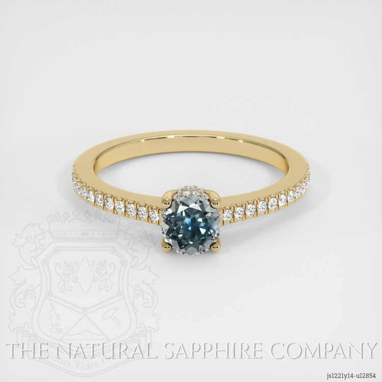 The ring features a beautiful, transparent 0.64 carat round shape bluish green sapphire with the dimensions of 5.03 x 4.98 x 3.51 mm and a brilliant cut. It has a clarity grade of eye clean (evaluated at eye level), medium intense color saturation, and an excellent polish. The origin of this sapphire is Montana.
