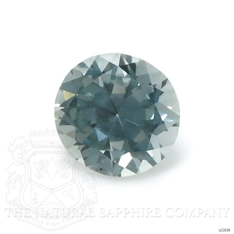 The ring features a beautiful, transparent 0.74 carat round shape bluish green sapphire with the dimensions of 5.53 x 5.26 x 3.53 mm and a brilliant cut. It has a clarity grade of very slightly included (evaluated at eye level), medium intense color saturation, and an excellent polish. The origin of this sapphire is Montana.