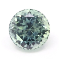 The ring features a beautiful, transparent 0.74 carat round shape bluish green sapphire with the dimensions of 5.15 x 5.12 x 3.81 mm and a mixed brilliant cut. It has a clarity grade of very slightly included (evaluated at eye level), intense color saturation, and an excellent polish. The origin of this sapphire is Montana.