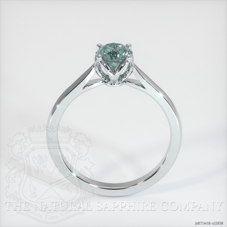 The ring features a beautiful, transparent 0.74 carat round shape bluish green sapphire with the dimensions of 5.53 x 5.26 x 3.53 mm and a brilliant cut. It has a clarity grade of very slightly included (evaluated at eye level), medium intense color saturation, and an excellent polish. The origin of this sapphire is Montana.