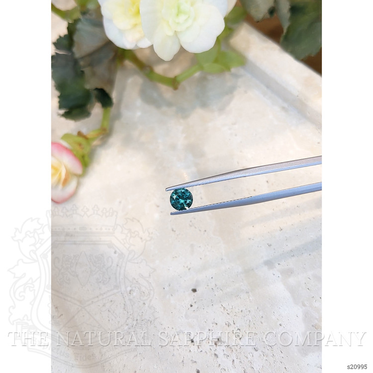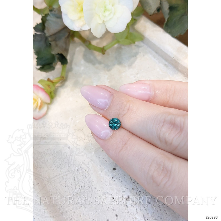 This ring centers on a transparent 0.89 carat round bluish green sapphire, measuring 5.70 by 5.70 by 3.77 mm, cut in a mixed brilliant style to balance scintillation and depth. The stone exhibits intense color saturation and an excellent polish, with a clarity grade of very slightly included, evaluated at eye level. The sapphire is heat treated to enhance color stability and visual appeal, and originates from Montana, a source noted for its distinct blue green tones. The gem is secured in a practical four prong setting and presented on a sculpted platinum 950 band, with subtle flowing motifs along the shoulders that integrate form with function. The Natural Sapphire Company provides this specification to convey the precise characteristics of the gem and mounting, emphasizing natural origin and conventional enhancement.