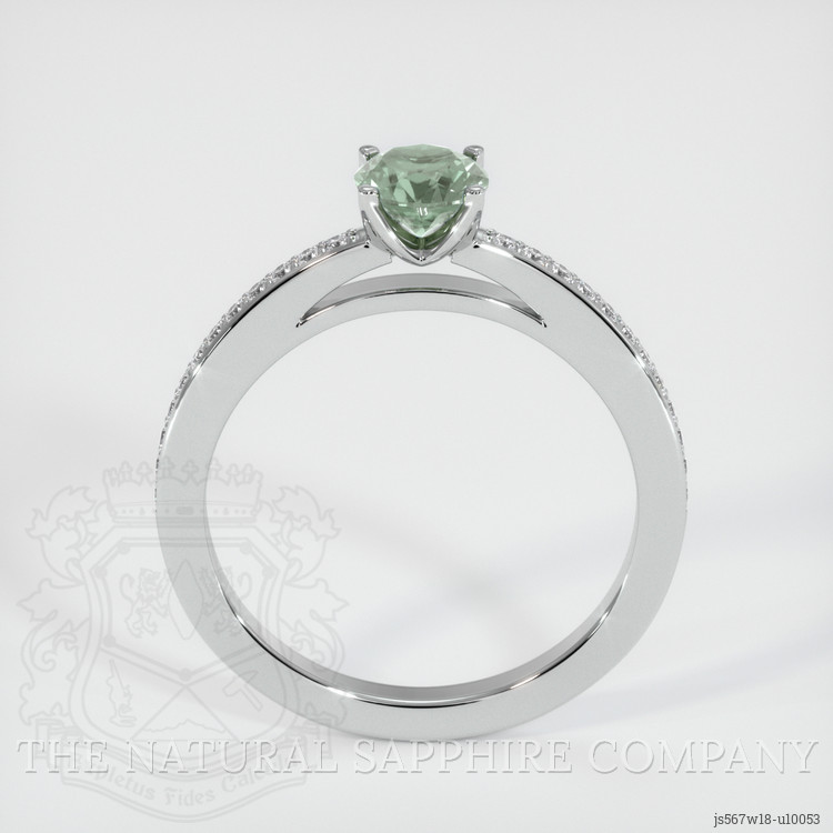 The ring features a beautiful, transparent 0.94 carat round shape bluish green sapphire with the dimensions of 5.92 x 5.89 x 4.01 mm and a brilliant cut. It has a clarity grade of very slightly included (evaluated at eye level), very light color saturation, and an excellent polish. The origin of this sapphire is Montana.