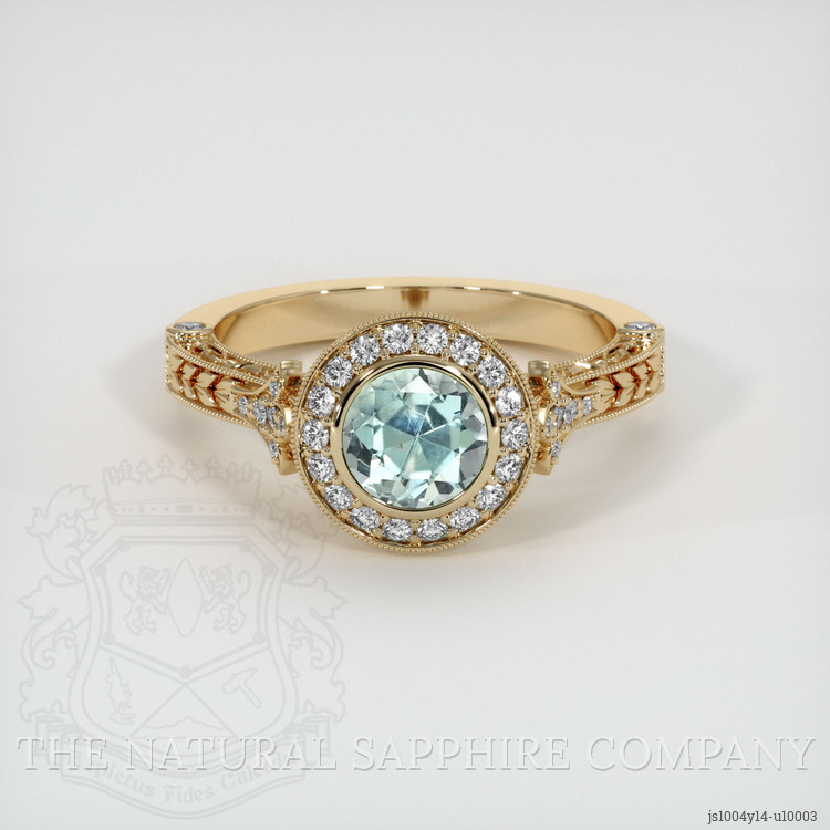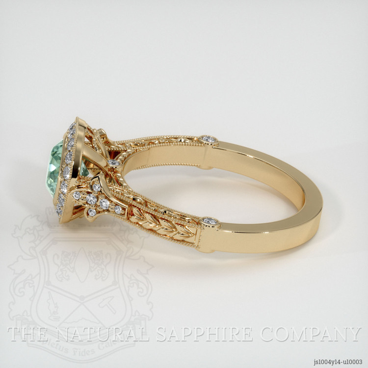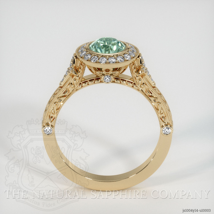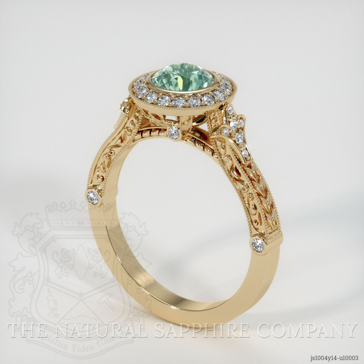 The ring features a beautiful, transparent 0.96 carat round shape bluish green sapphire with the dimensions of 5.85 x 5.81 x 4.06 mm and a mixed brilliant cut. It has a clarity grade of very slightly included (evaluated at eye level), medium color saturation, and an excellent polish. The origin of this sapphire is Montana.