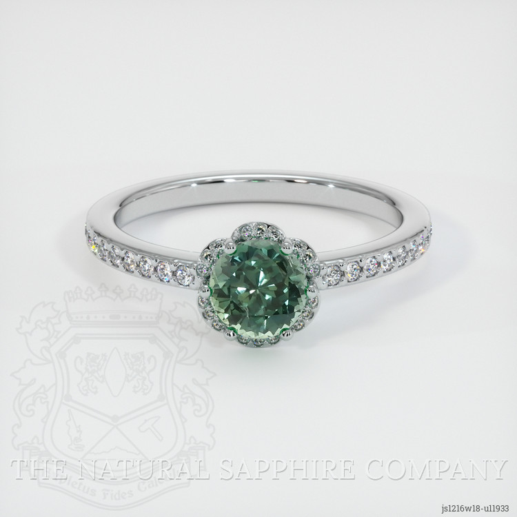 The ring features a beautiful, transparent 1.01 carat round shape bluish green sapphire with the dimensions of 5.51 x 5.46 x 4.19 mm and a mixed brilliant cut. It has a clarity grade of very slightly included (evaluated at eye level), intense color saturation, and an excellent polish. The origin of this sapphire is Montana.