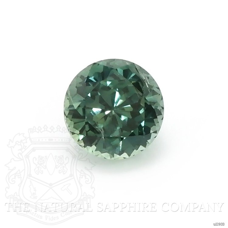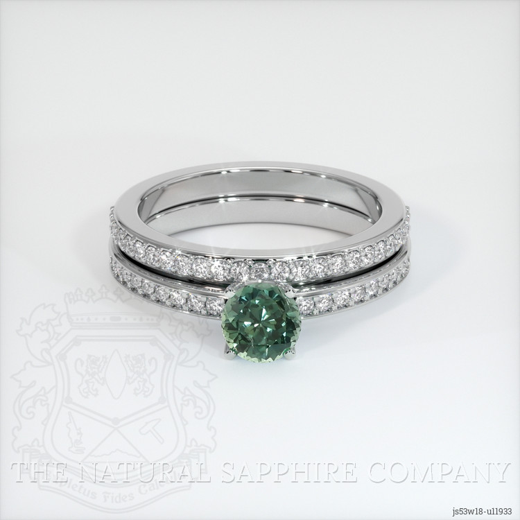 The ring features a beautiful, transparent 1.01 carat round shape bluish green sapphire with the dimensions of 5.51 x 5.46 x 4.19 mm and a mixed brilliant cut. It has a clarity grade of very slightly included (evaluated at eye level), intense color saturation, and an excellent polish. The origin of this sapphire is Montana.