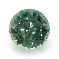 The ring features a beautiful, transparent 1.01 carat round shape bluish green sapphire with the dimensions of 5.51 x 5.46 x 4.19 mm and a mixed brilliant cut. It has a clarity grade of very slightly included (evaluated at eye level), intense color saturation, and an excellent polish. The origin of this sapphire is Montana.