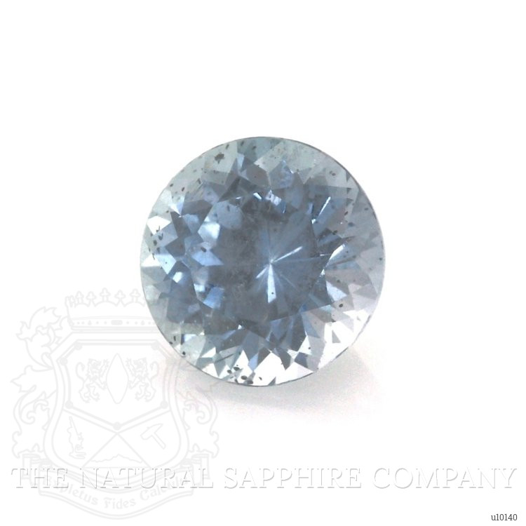 The ring features a beautiful, transparent 1.17 carat round shape bluish green sapphire with the dimensions of 6.21 x 6.12 x 4.26 mm and a mixed brilliant cut. It has a clarity grade of very slightly included (evaluated at eye level), medium color saturation, and an excellent polish. The origin of this sapphire is Montana.