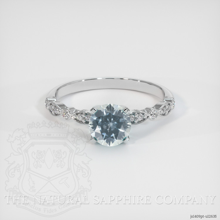 The ring features a beautiful, transparent 1.25 carat round shape bluish green sapphire with the dimensions of 6.45 x 6.41 x 4.25 mm and a mixed brilliant cut. It has a clarity grade of very slightly included (evaluated at eye level), very light color saturation, and an excellent polish. The origin of this sapphire is Montana.