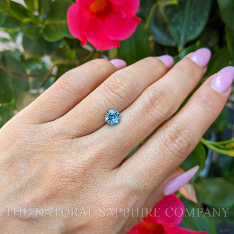 The ring features a beautiful, transparent 1.53 carat round shape bluish green sapphire with the dimensions of 6.40 x 6.31 x 4.82 mm and a mixed brilliant cut. It has a clarity grade of slightly included (evaluated at eye level), medium intense color saturation, and an excellent polish. The origin of this sapphire is Montana.
