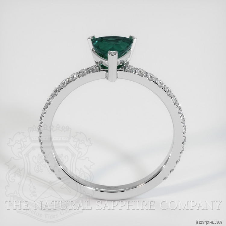 The ring features a beautiful, transparent 0.83 carat trillion shape bluish green sapphire with the dimensions of 5.91 x 5.61 x 3.33 mm and a trillion cut. It has a clarity grade of eye clean (evaluated at eye level), vivid color saturation, and an excellent polish. The origin of this sapphire is Montana.