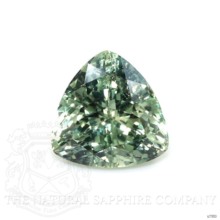 The ring features a beautiful, transparent 6.36 carat trillion shape bluish green sapphire with the dimensions of 11.40 x 11.27 x 6.90 mm and a trillion cut. It has a clarity grade of very slightly included (evaluated at eye level), medium intense color saturation, and an excellent polish. The origin of this sapphire is Montana.