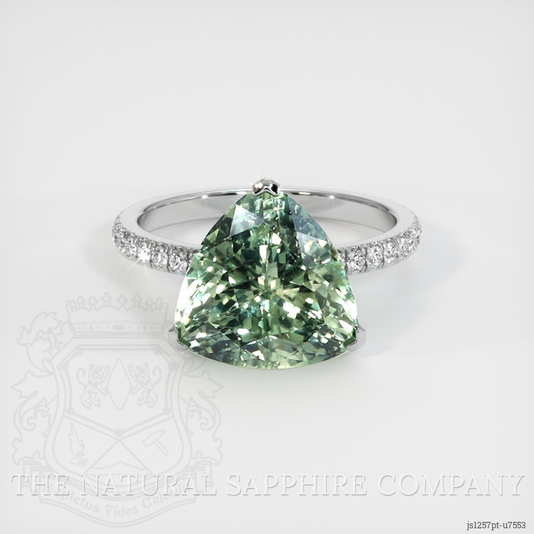 The ring features a beautiful, transparent 6.36 carat trillion shape bluish green sapphire with the dimensions of 11.40 x 11.27 x 6.90 mm and a trillion cut. It has a clarity grade of very slightly included (evaluated at eye level), medium intense color saturation, and an excellent polish. The origin of this sapphire is Montana.