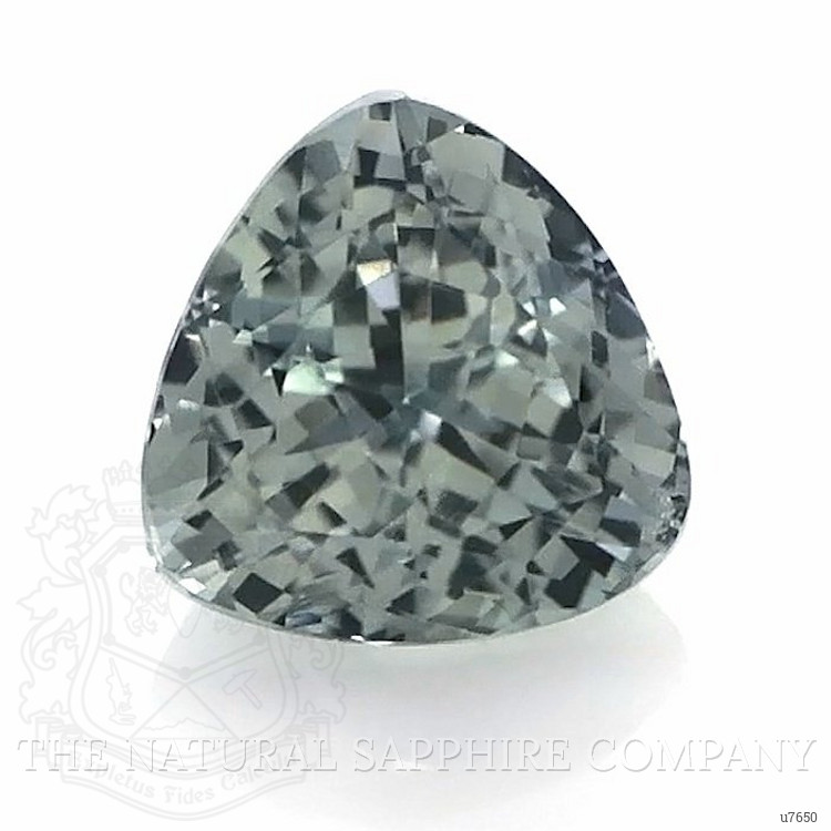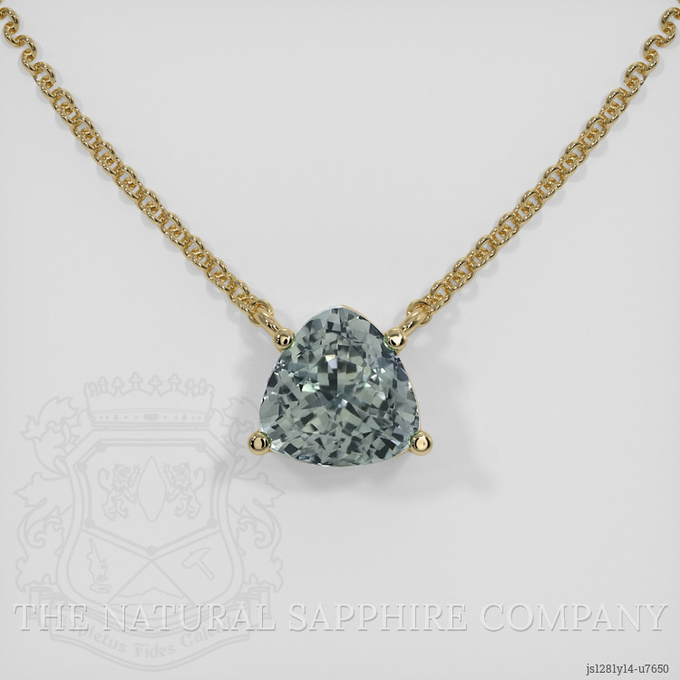 The necklace features a beautiful, transparent 0.93 carat trillion shape bluish grey sapphire with the dimensions of 5.72 x 5.82 x 3.92 mm and a trillion cut. It has a clarity grade of very slightly included (evaluated at eye level), medium color saturation, and an excellent polish. The origin of this sapphire is Montana.