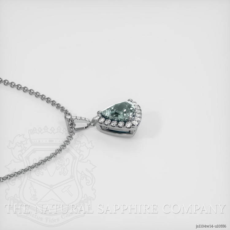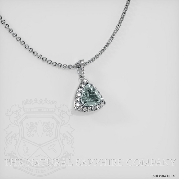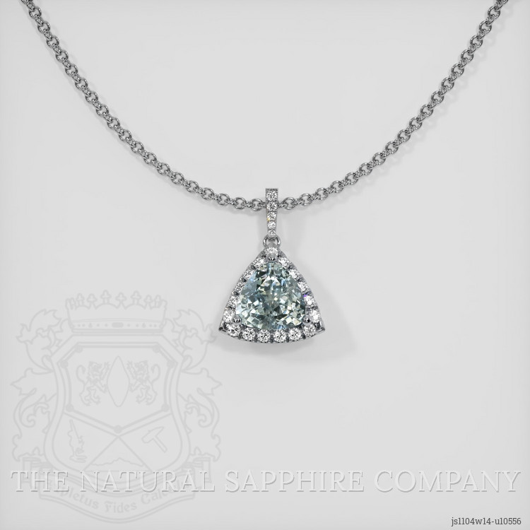 The pendant features a beautiful, transparent 1.22 carat trillion shape bluish grey sapphire with the dimensions of 6.64 x 6.83 x 3.99 mm and a trillion cut. It has a clarity grade of very slightly included (evaluated at eye level), medium color saturation, and an excellent polish. The origin of this sapphire is Montana.