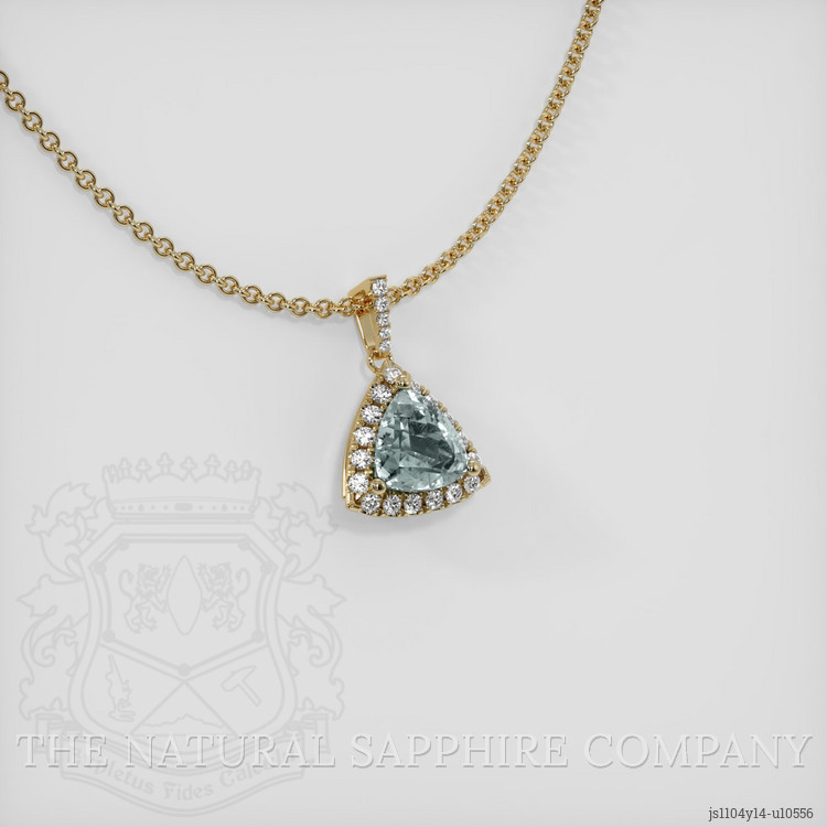 The pendant features a beautiful, transparent 1.22 carat trillion shape bluish grey sapphire with the dimensions of 6.64 x 6.83 x 3.99 mm and a trillion cut. It has a clarity grade of very slightly included (evaluated at eye level), medium color saturation, and an excellent polish. The origin of this sapphire is Montana.