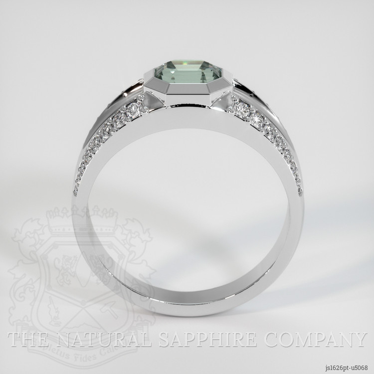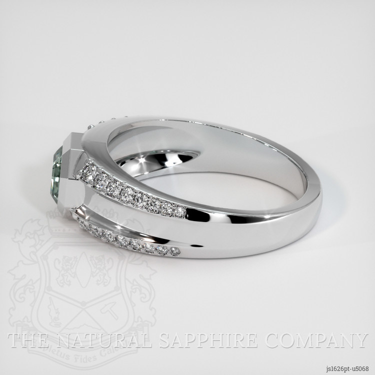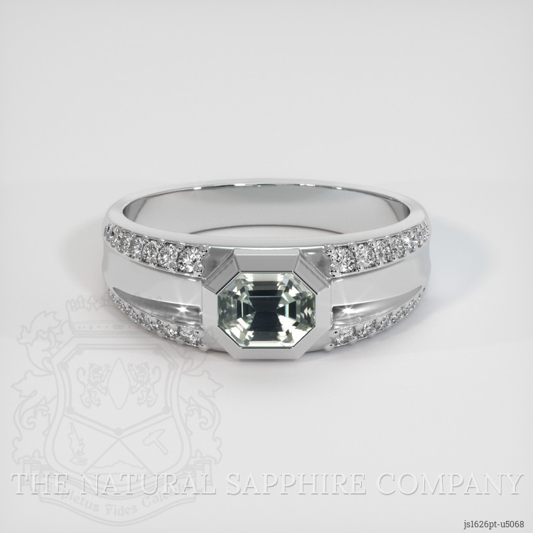 The men's ring features a beautiful, transparent 0.91 carat emerald cut shape bluish grey sapphire with the dimensions of 5.70 x 4.65 x 3.70 mm and a emerald cut. It has a clarity grade of eye clean (evaluated at eye level), medium intense color saturation, and an excellent polish. The origin of this sapphire is Montana.