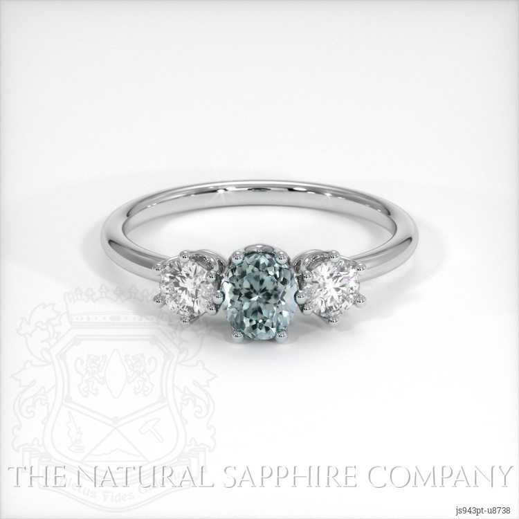 The ring features a beautiful, transparent 0.69 carat oval shape bluish grey sapphire with the dimensions of 5.48 x 4.82 x 3.49 mm and a mixed brilliant cut. It has a clarity grade of very slightly included (evaluated at eye level), medium intense color saturation, and an excellent polish. The origin of this sapphire is Montana.
