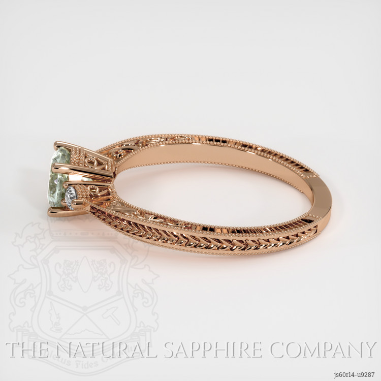 The ring features a beautiful, transparent 0.76 carat round shape green sapphire with the dimensions of 5.41 x 5.36 x 3.69 mm and a modified brilliant cut. It has a clarity grade of very slightly included (evaluated at eye level), medium color saturation, and an excellent polish. The origin of this sapphire is Ceylon (Sri Lanka).