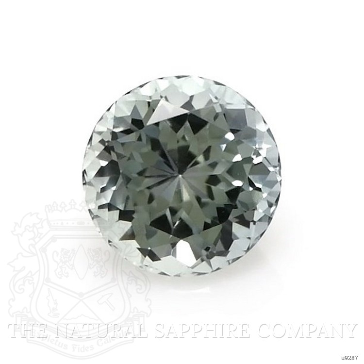 The ring features a beautiful, transparent 0.76 carat round shape bluish grey sapphire with the dimensions of 5.41 x 5.36 x 3.69 mm and a modified brilliant cut. It has a clarity grade of very slightly included (evaluated at eye level), medium color saturation, and an excellent polish. The origin of this sapphire is Ceylon (Sri Lanka).