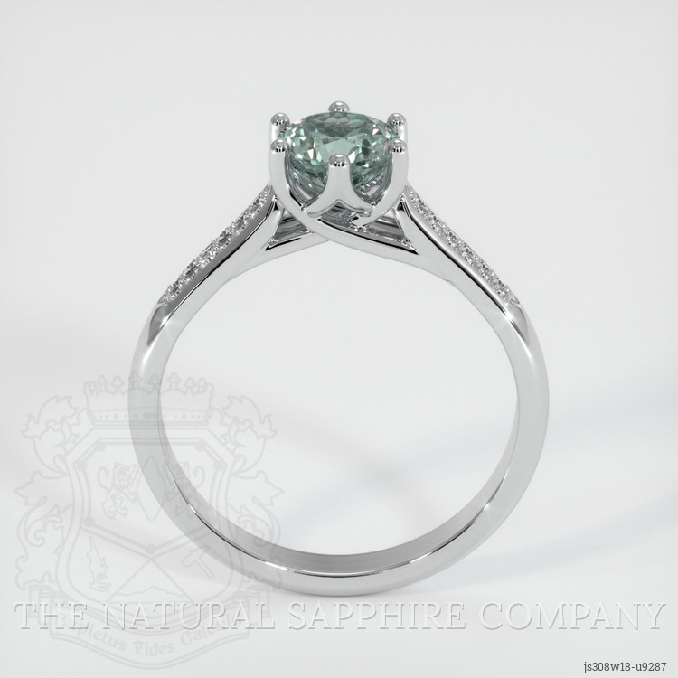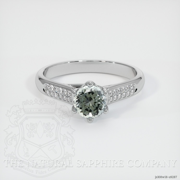 The ring features a beautiful, transparent 0.76 carat round shape bluish grey sapphire with the dimensions of 5.41 x 5.36 x 3.69 mm and a modified brilliant cut. It has a clarity grade of very slightly included (evaluated at eye level), medium color saturation, and an excellent polish. The origin of this sapphire is Ceylon (Sri Lanka).