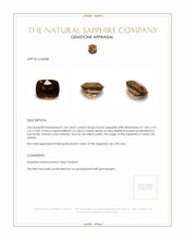 The ring features a beautiful, transparent 1.44 carat cushion shape brown sapphire with the dimensions of 7.04 x 5.61 x 4.17 mm and a mixed brilliant cut. It has a clarity grade of very slightly included (evaluated at eye level), intense color saturation, and an excellent polish. The origin of this sapphire is Ceylon (Sri Lanka).