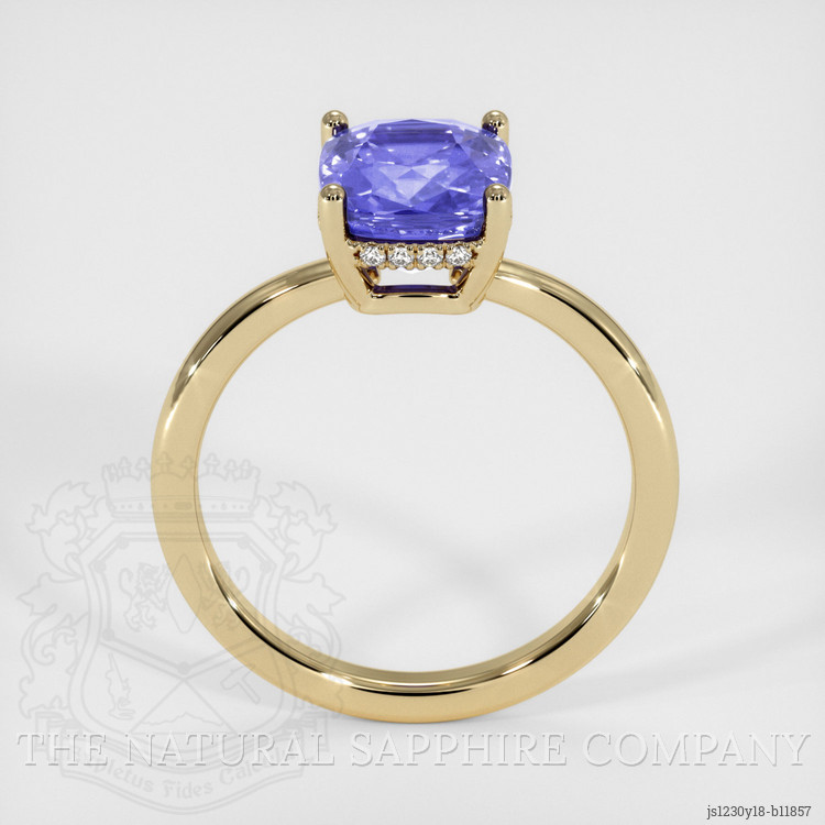 The ring features a beautiful, transparent 3.00 carat cushion shape color change sapphire with the dimensions of 8.68 x 7.33 x 5.55 mm and a mixed brilliant cut. It has a clarity grade of very slightly included (evaluated at eye level), intense color saturation, and an excellent polish. The origin of this sapphire is Ceylon (Sri Lanka).