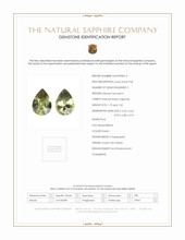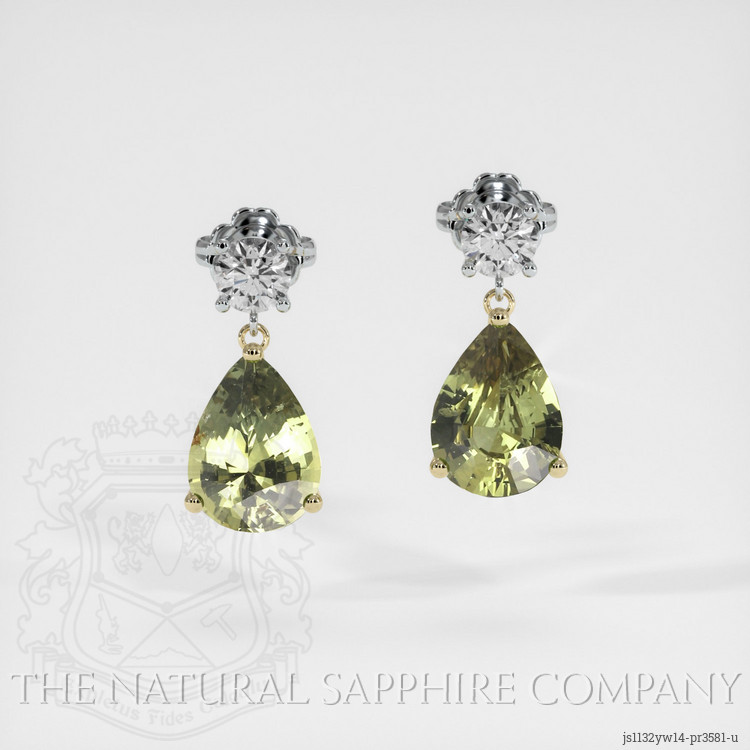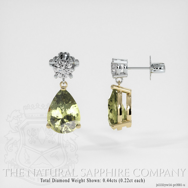 The earrings feature a beautiful, transparent pair of sapphires that are 3.20 total carat weight. They are pear shape green sapphires, with the dimensions of 8.90 x 6.54 x 4.24 mm and are mixed brilliant cut, have a clarity grade of very slightly included (evaluated at eye level), intense color saturation, and an excellent polish. The origin of this pair of sapphires is Ceylon (Sri Lanka).