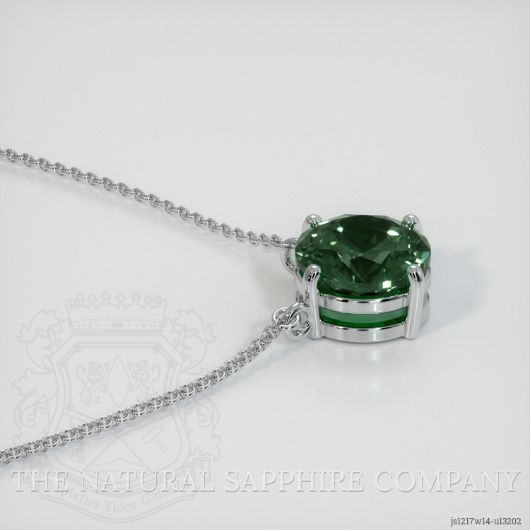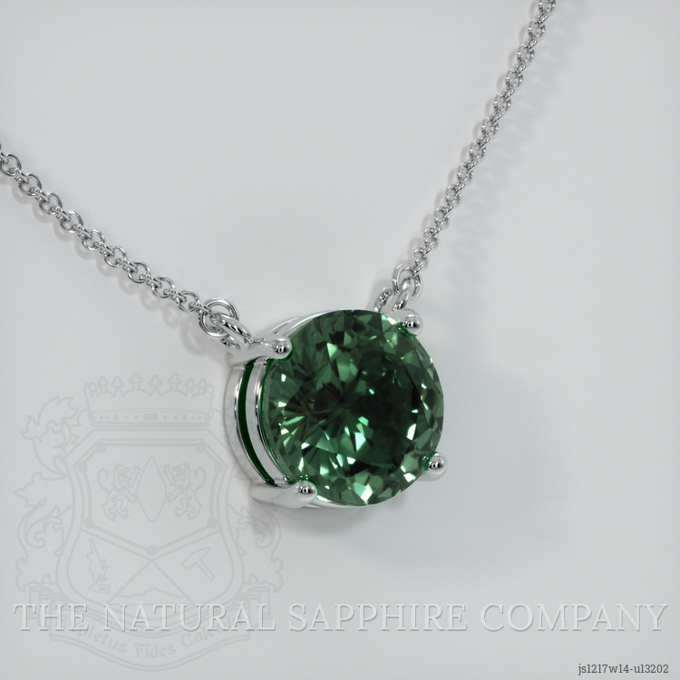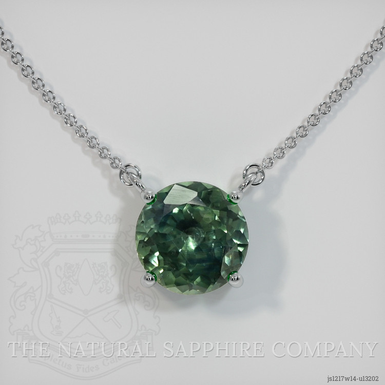 The necklace features a beautiful, transparent 1.66 carat round shape green sapphire with the dimensions of 7.02 x 6.93 x 4.37 mm and a mixed brilliant cut. It has a clarity grade of very slightly included (evaluated at eye level), intense color saturation, and an excellent polish. The origin of this sapphire is Montana.