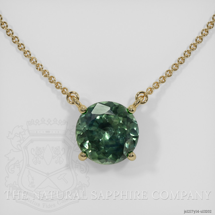 The necklace features a beautiful, transparent 1.66 carat round shape green sapphire with the dimensions of 7.02 x 6.93 x 4.37 mm and a mixed brilliant cut. It has a clarity grade of very slightly included (evaluated at eye level), intense color saturation, and an excellent polish. The origin of this sapphire is Montana.