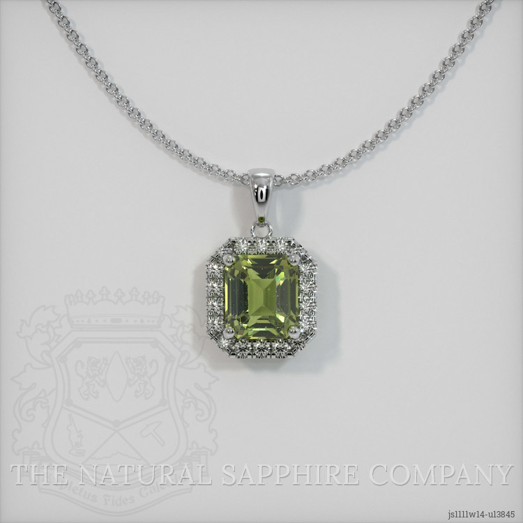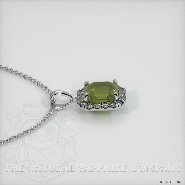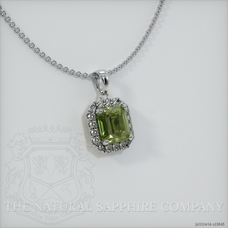 The pendant features a beautiful, transparent 1.91 carat emerald cut shape green sapphire with the dimensions of 7.11 x 6.19 x 4.37 mm and a emerald cut. It has a clarity grade of very slightly included (evaluated at eye level), intense color saturation, and an excellent polish. The origin of this sapphire is Ceylon (Sri Lanka).