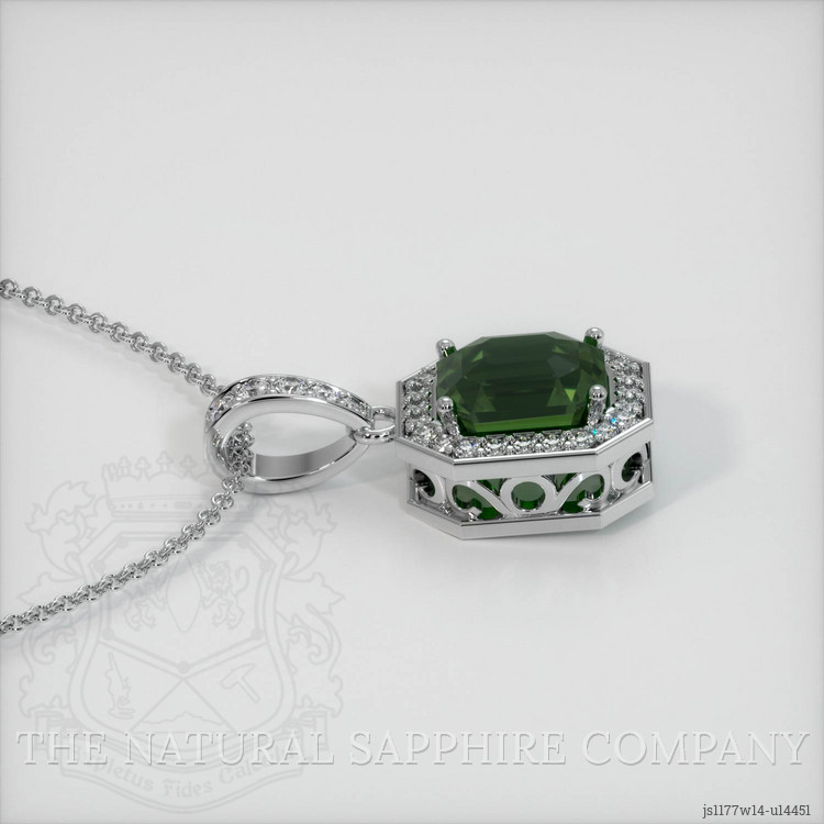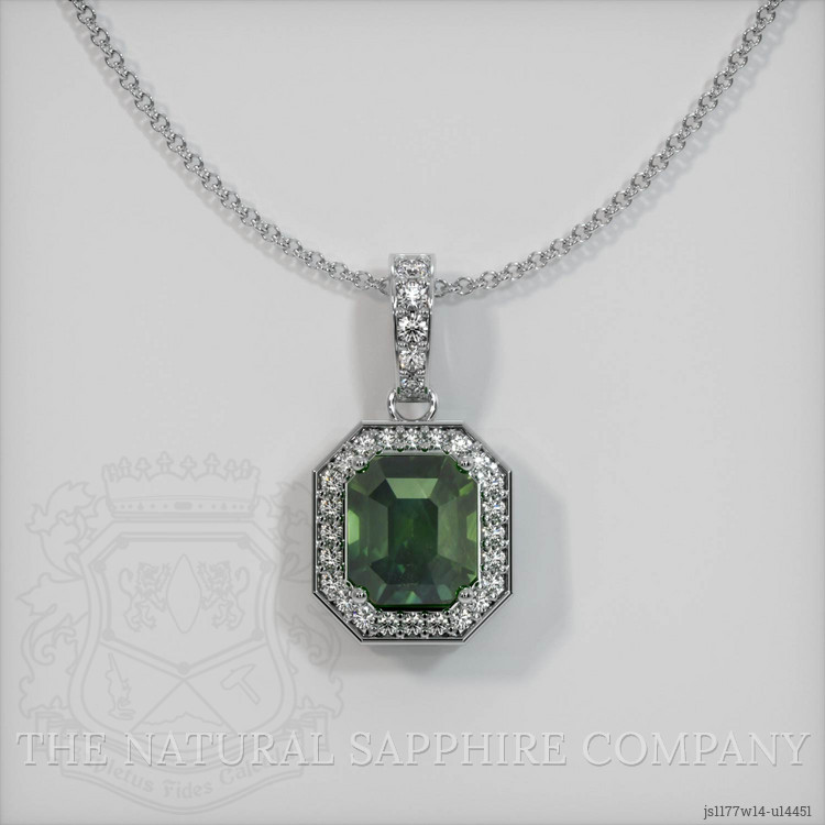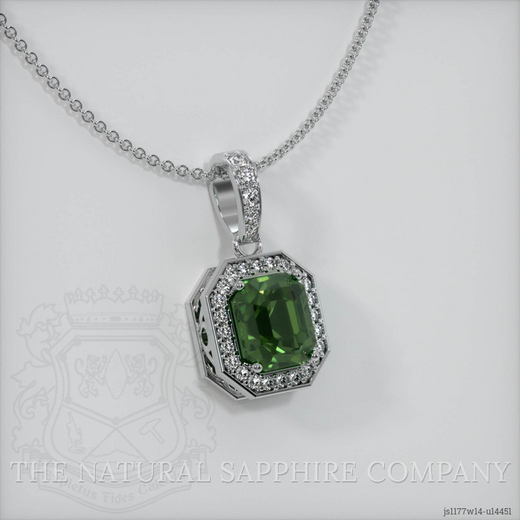 The pendant features a beautiful, transparent C.Dunaigre certified Green 3.66 carat emerald cut shape green sapphire with the dimensions of 8.39 x 7.24 x 6.34 mm and a emerald cut. It has a clarity grade of very slightly included (evaluated at eye level), intense color saturation, and an excellent polish. The origin of this sapphire is Madagascar.