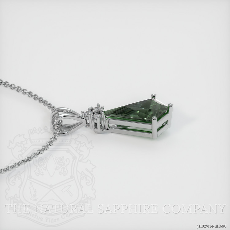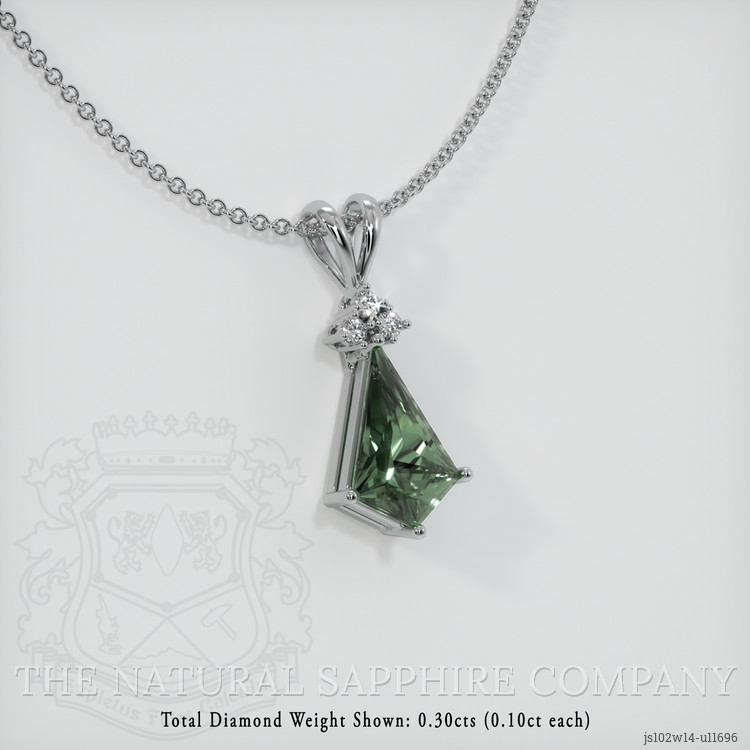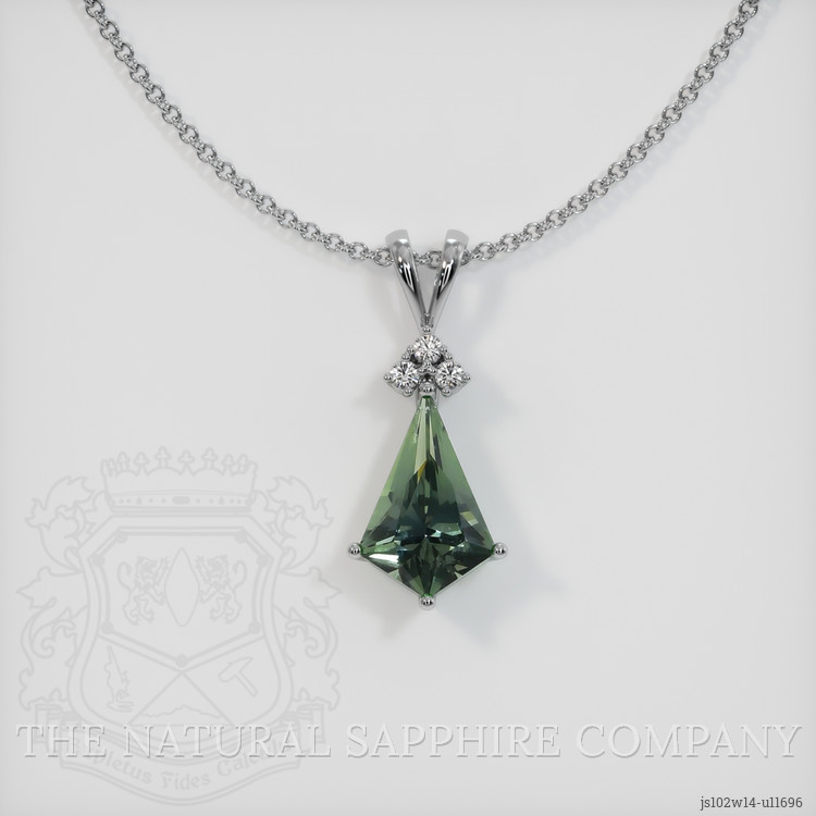 The pendant features a beautiful, transparent 2.18 carat fancy shape green sapphire with the dimensions of 12.32 x 8.05 x 4.75 mm and a fancy brilliant cut. It has a clarity grade of eye clean (evaluated at eye level), intense color saturation, and an excellent polish. The origin of this sapphire is Montana.