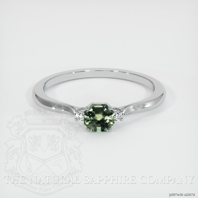 The ring features a beautiful, transparent 0.52 carat asscher shape green sapphire with the dimensions of 4.68 x 4.37 x 3.13 mm and a asscher cut. It has a clarity grade of very slightly included (evaluated at eye level), medium intense color saturation, and an excellent polish. The origin of this sapphire is Montana.