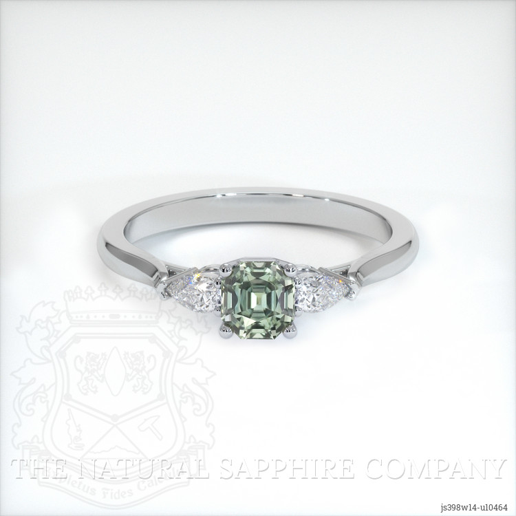 The ring features a beautiful, transparent 0.61 carat asscher - octagon shape green sapphire with the dimensions of 4.72 x 4.45 x 3.46 mm and a asscher cut. It has a clarity grade of eye clean (evaluated at eye level), medium color saturation, and an excellent polish. The origin of this sapphire is Montana.