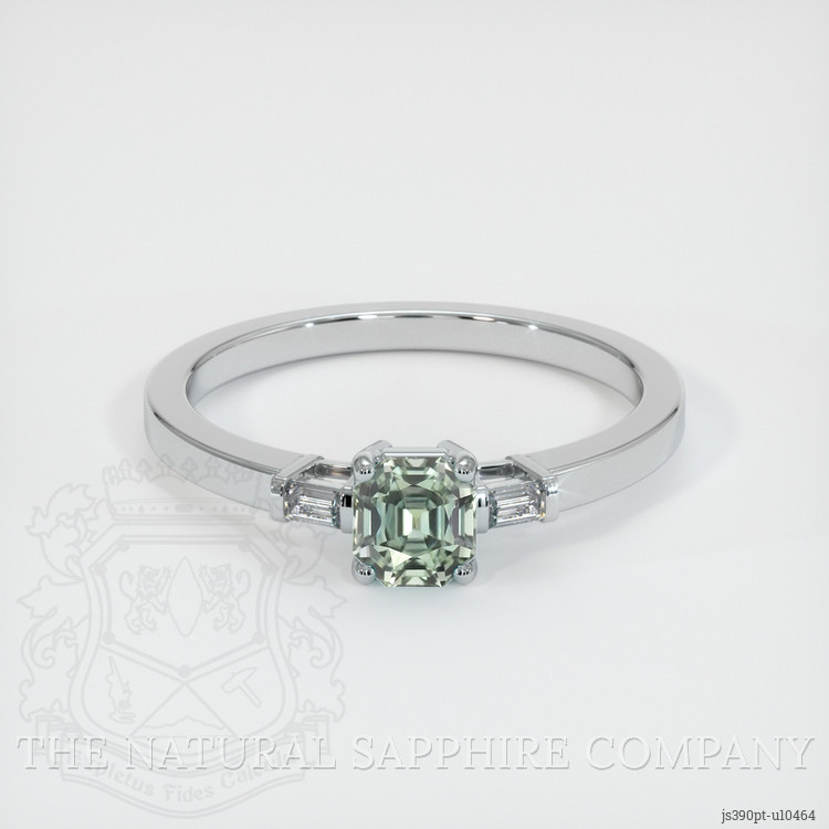 The ring features a beautiful, transparent 0.61 carat asscher - octagon shape green sapphire with the dimensions of 4.72 x 4.45 x 3.46 mm and a asscher cut. It has a clarity grade of eye clean (evaluated at eye level), medium color saturation, and an excellent polish. The origin of this sapphire is Montana.