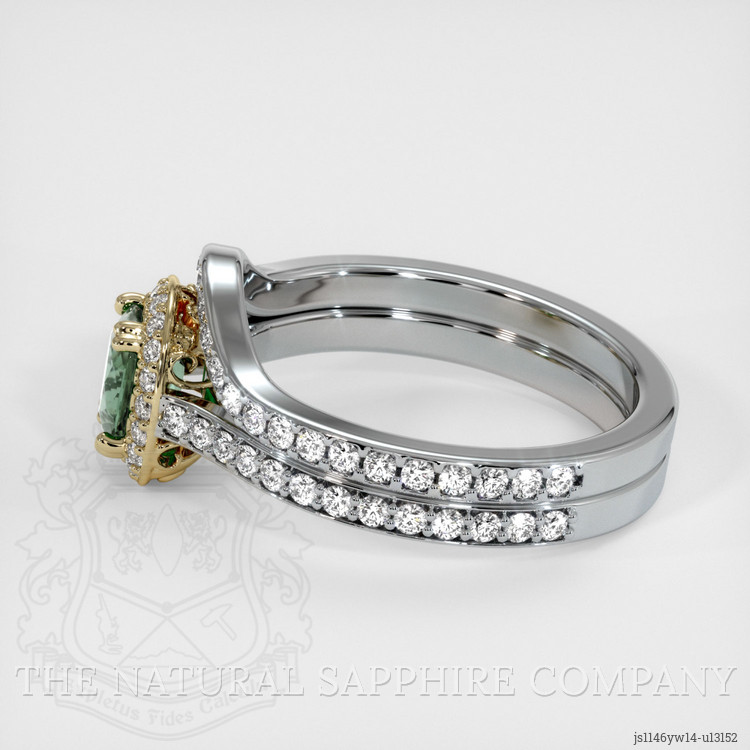 The ring features a beautiful, transparent 0.66 carat cushion shape green sapphire with the dimensions of 5.72 x 4.36 x 3.17 mm and a mixed brilliant cut. It has a clarity grade of very slightly included (evaluated at eye level), intense color saturation, and an excellent polish. The origin of this sapphire is Montana.