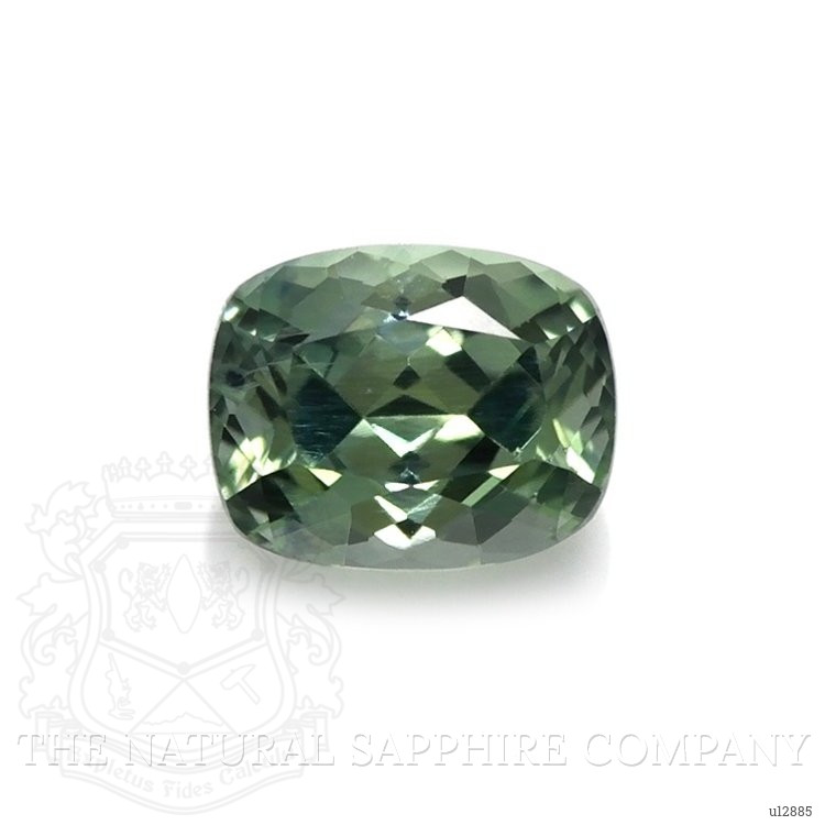 The ring features a beautiful, transparent 0.67 carat cushion shape green sapphire with the dimensions of 5.52 x 4.42 x 3.21 mm and a mixed brilliant cut. It has a clarity grade of very slightly included (evaluated at eye level), intense color saturation, and an excellent polish. The origin of this sapphire is Montana.