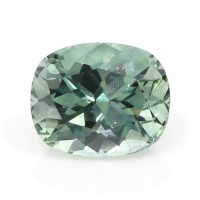 The ring features a beautiful, transparent 0.73 carat cushion shape green sapphire with the dimensions of 5.79 x 4.76 x 3.54 mm and a mixed brilliant cut. It has a clarity grade of very slightly included (evaluated at eye level), medium color saturation, and an excellent polish. The origin of this sapphire is Montana.