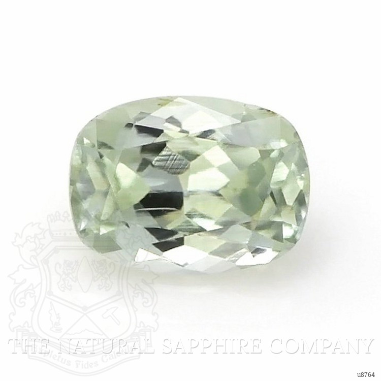 The ring features a beautiful, transparent 0.80 carat cushion shape green sapphire with the dimensions of 6.13 x 4.59 x 3.28 mm and a mixed brilliant cut. It has a clarity grade of very slightly included (evaluated at eye level), medium light color saturation, and an excellent polish. The origin of this sapphire is Montana.