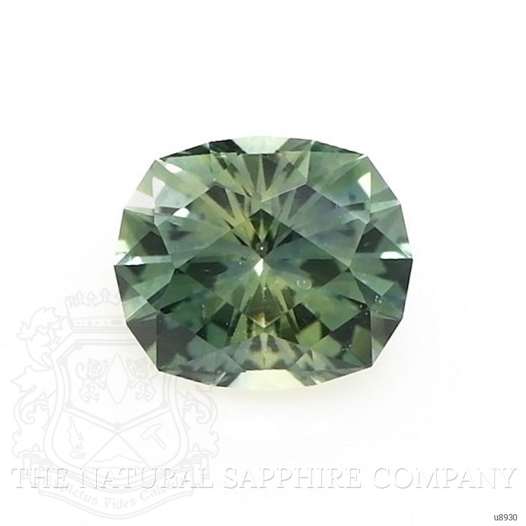 The ring features a beautiful, transparent 0.99 carat cushion shape green sapphire with the dimensions of 6.60 x 5.62 x 3.89 mm and a fancy brilliant cut. It has a clarity grade of very slightly included (evaluated at eye level), vivid color saturation, and an excellent polish. The origin of this sapphire is Montana.