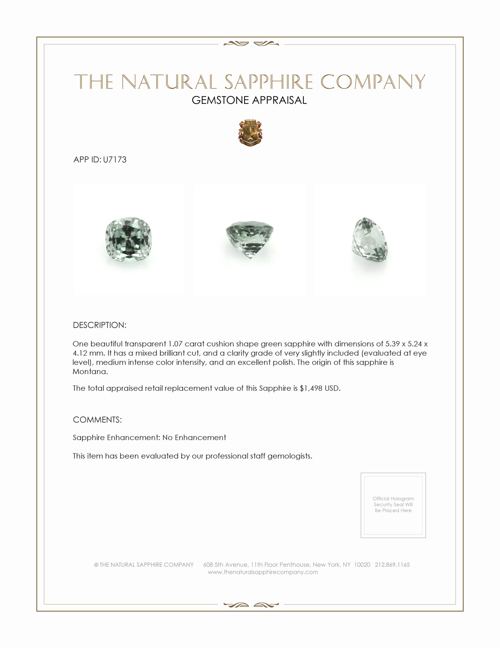 At The Natural Sapphire Company, we believe that each gemstone tells a story, a tale of elegance and timeless beauty. Our exquisite ring, featuring a breathtaking 1.07 carat cushion-shaped green sapphire, stands as a testament to this belief, offering a piece that is not just jewelry but an experience that captures hearts. Imagine a gem with dimensions that highlight its natural allure, whispering a delicate tale of Montana's rich earth where it originated. This sapphire, with its medium intense color saturation and mixed brilliant cut, reveals a dance of light that is unparalleled. The clarity grade of very slightly included, evaluated at eye level, ensures a remarkable gemstone that provides a connection to nature, bringing an ethereal quality to this exquisite piece.
