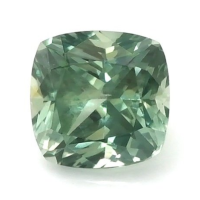 The ring features a beautiful, transparent 1.21 carat cushion shape green sapphire with the dimensions of 5.69 x 5.62 x 4.33 mm and a mixed brilliant cut. It has a clarity grade of very slightly included (evaluated at eye level), medium intense color saturation, and an excellent polish. The origin of this sapphire is Montana.