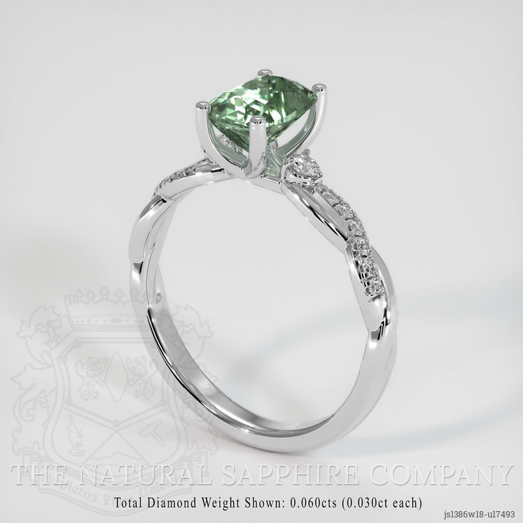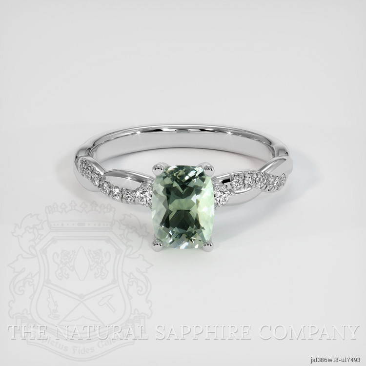 Indulge in the epitome of luxury with our exquisite ring from The Natural Sapphire Company, where timeless elegance meets modern sophistication. Nestled at the heart of this masterpiece is a mesmerizing 1.42 carat cushion-shaped green sapphire. This captivating gem, sourced from the pristine landscapes of Montana, is a vivacious testament to nature’s unparalleled beauty. Its dimensions of 7.31 x 5.43 x 4.30 mm showcase an impeccable mixed brilliant cut, enhancing the sapphire’s medium intense color saturation and granting it an almost ethereal glow. The clarity of this sapphire is judged as very slightly included, promising a flawless appearance to the naked eye that will leave an indelible impression.