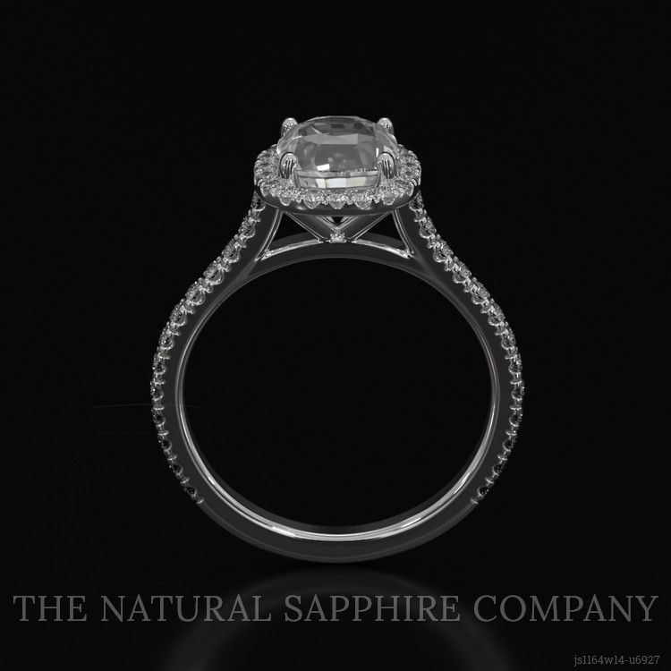 The ring features a beautiful, transparent 1.79 carat cushion shape green sapphire with the dimensions of 6.42 x 6.40 x 5.08 mm and a mixed brilliant cut. It has a clarity grade of very slightly included (evaluated at eye level), faint color saturation, and an excellent polish. Enhancement: no enhancement. The origin of this sapphire is Montana.