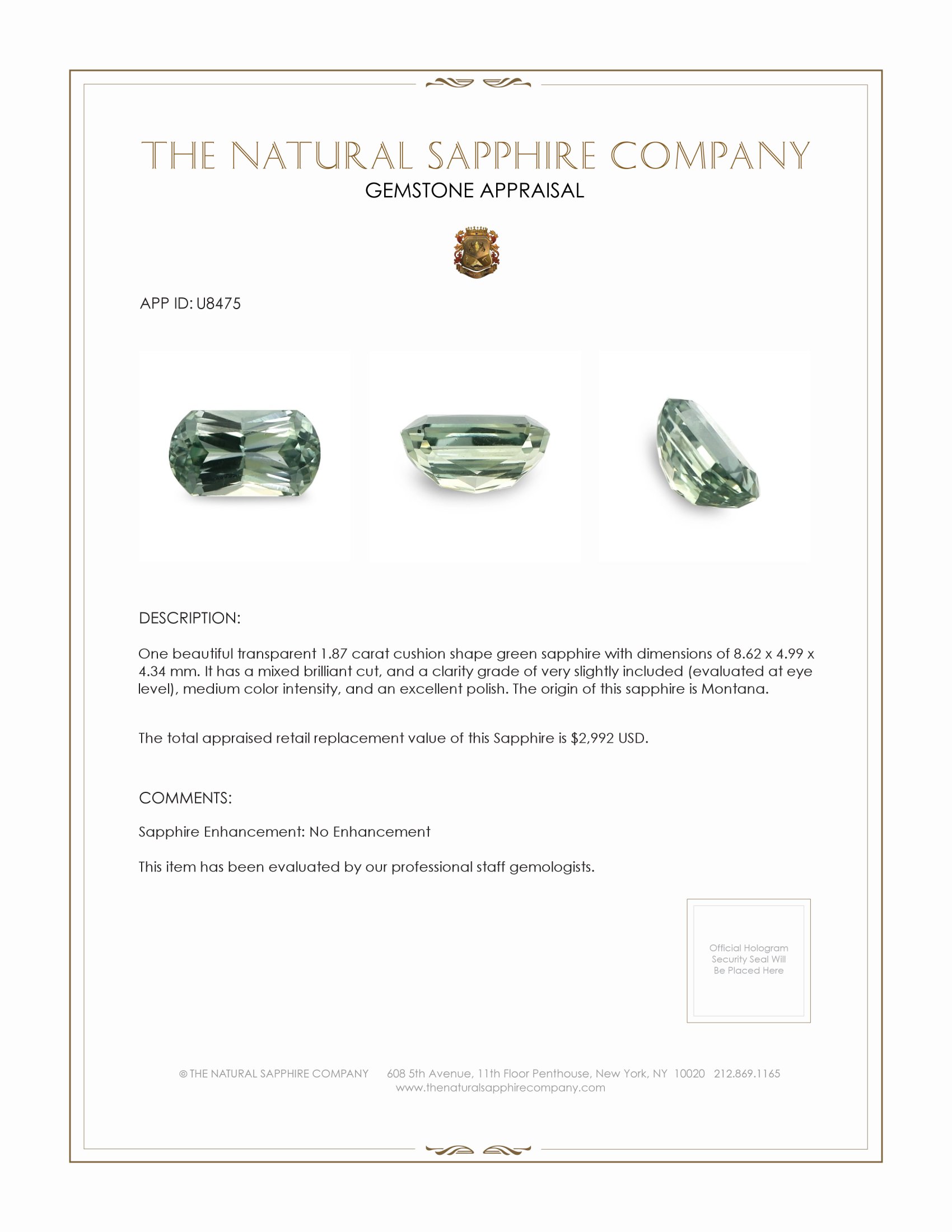 Discover the epitome of elegance and rarity with our exquisite green sapphire ring, exclusively offered by The Natural Sapphire Company. This piece is more than just jewelry. It is a testament to fine craftsmanship and the remarkable beauty found in nature. At the heart of this enchanting ring is a stunning transparent 1.87-carat cushion-shaped green sapphire. Originating in the mystical lands of Montana, this gemstone conjures images of lush forests and verdant meadows, perfectly captured in its gentle green hue. With dimensions of 8.62 x 4.99 x 4.34 mm, the sapphire is masterfully cut in a mixed brilliant style, ensuring it exudes a magnificent sparkle and life.