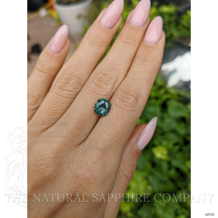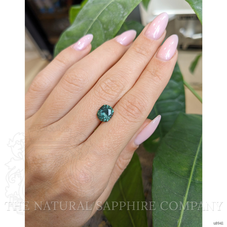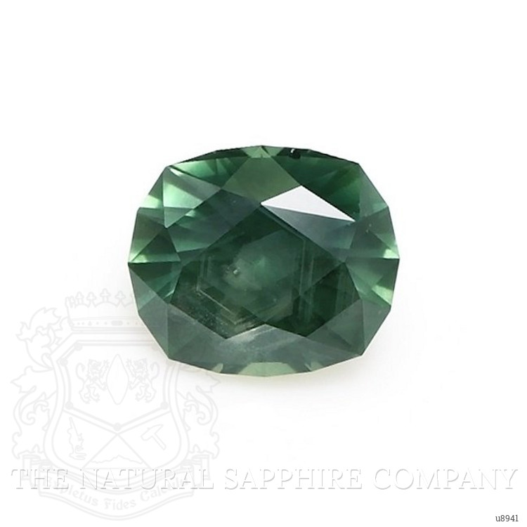 The ring features a beautiful, transparent 2.22 carat cushion shape green sapphire with the dimensions of 8.54 x 7.27 x 5.14 mm and a fancy brilliant cut. It has a clarity grade of very slightly included (evaluated at eye level), vivid color saturation, and an excellent polish. The origin of this sapphire is Montana.