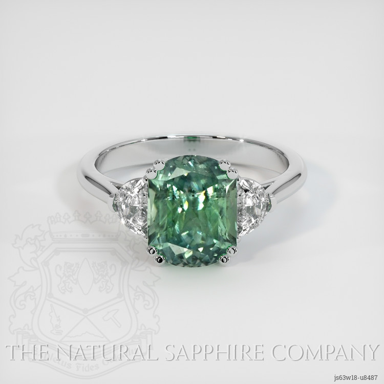 The ring features a beautiful, transparent 2.44 carat cushion shape green sapphire with the dimensions of 7.98 x 6.32 x 4.91 mm and a mixed brilliant cut. It has a clarity grade of slightly included (evaluated at eye level), vivid color saturation, and an excellent polish. The origin of this sapphire is Montana.
