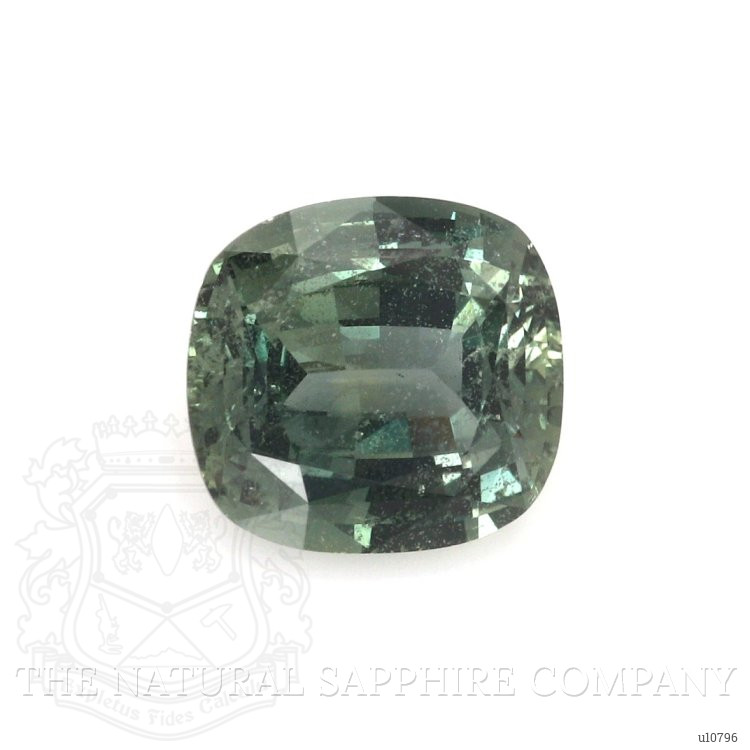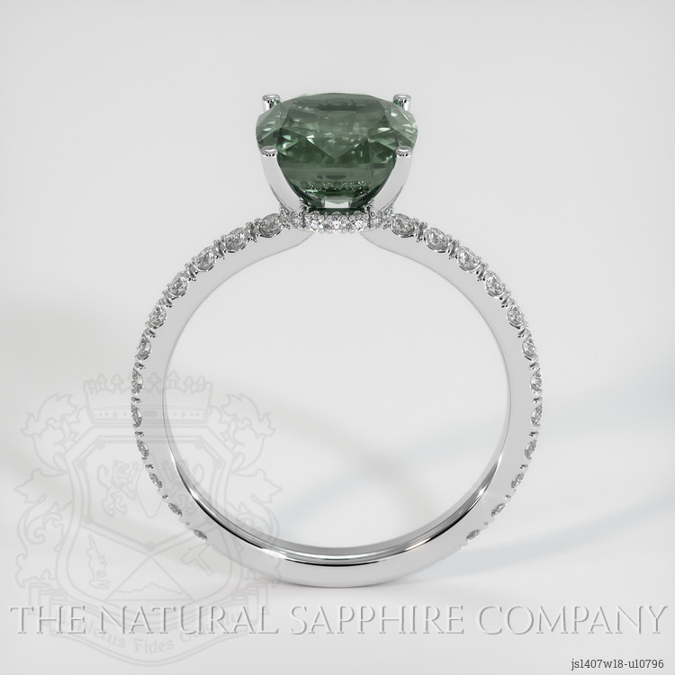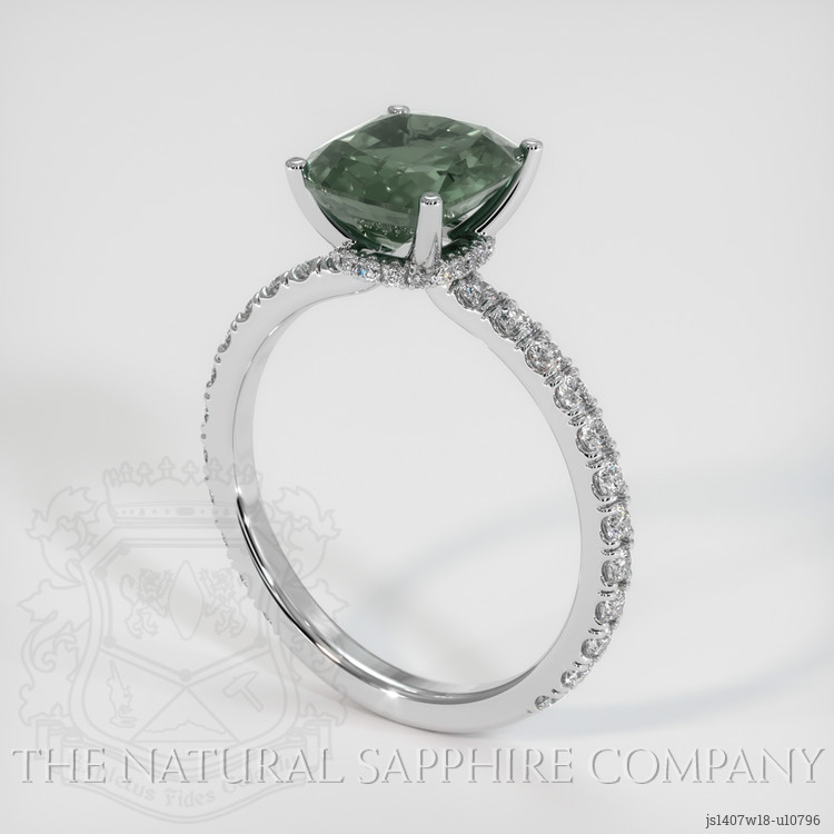 The ring features a beautiful, transparent GIA certified Green 2.64 carat cushion shape green sapphire with the dimensions of 8.45 x 7.91 x 4.31 mm and a mixed brilliant cut. It has a clarity grade of slightly included (evaluated at eye level), intense color saturation, and an excellent polish. The origin of this sapphire is Ceylon (Sri Lanka).